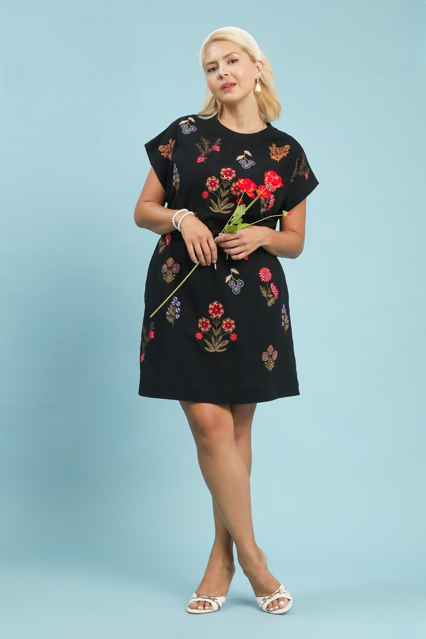 This embroidered floral dress features stunning multicolor floral embroidery that adds a vibrant and playful touch to the garment. The short sleeves provide a breezy and comfortable fit for warmer weather. An adjustable drawstring waist tie allows for a customizable and flattering look.
