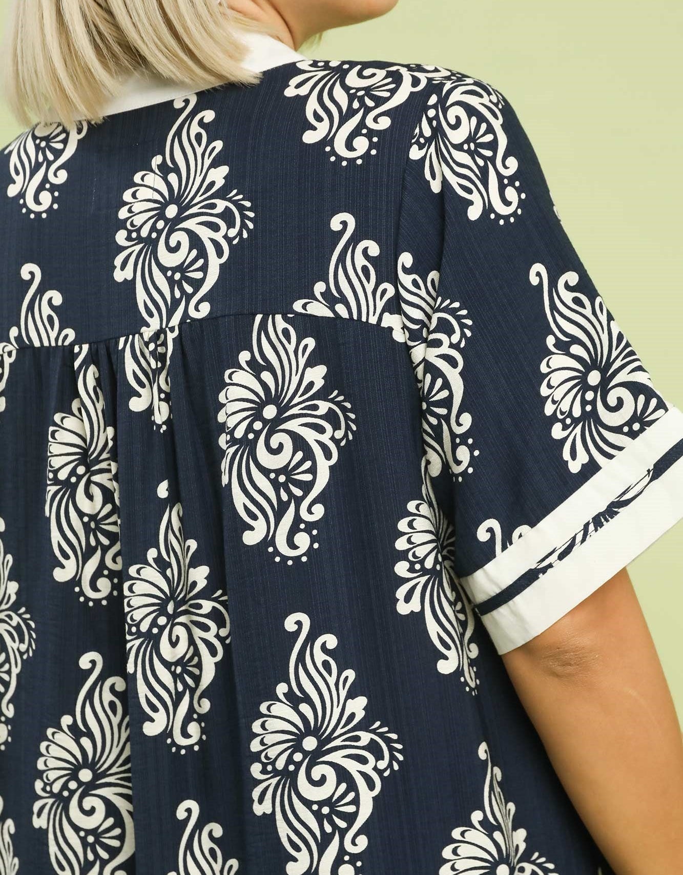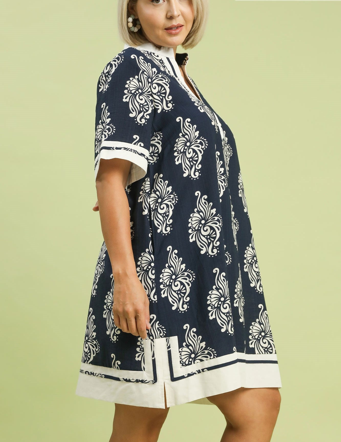 Embrace elegance with this Abstract Print Tunic now in navy. The 3/4 sleeves and print add a refined touch, while the tunic style ensures comfortable wear and a flattering silhouette. Perfect for dressing up or down, this dress combines classic baroque like patterns with modern ease, making it a versatile addition to your wardrobe.