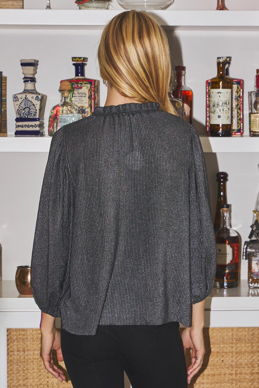 Experience sparkling style this season in Metallic Foiled Ribbed Top. Its shimmery fabric, 3/4 sleeves, elasticated cuffs high ruffled neck make it the perfect choice for any party. The shimmer adds a touch of glamour. Dress it down with jeans or dress it up for the ultimate party-ready ensemble.
