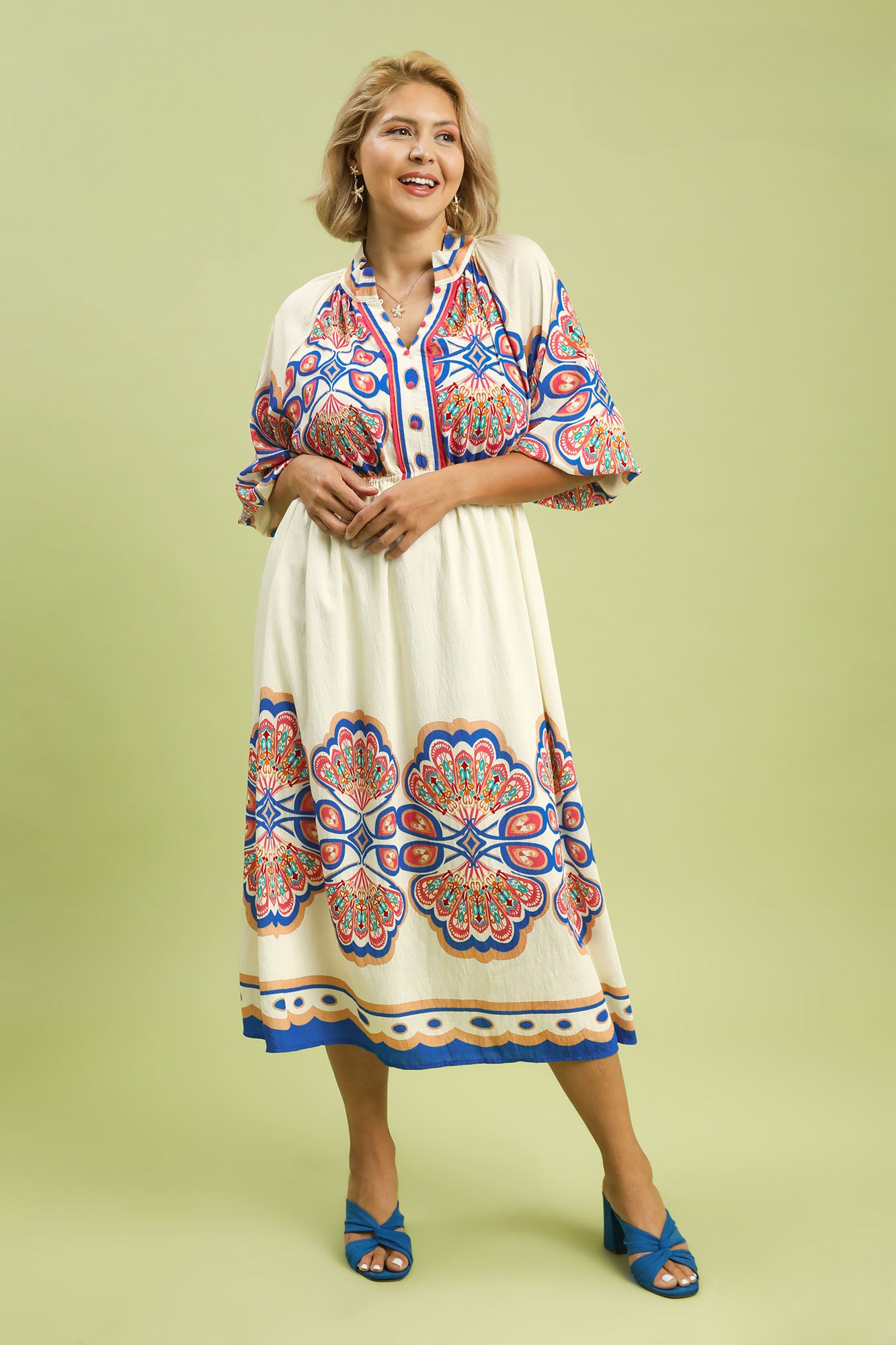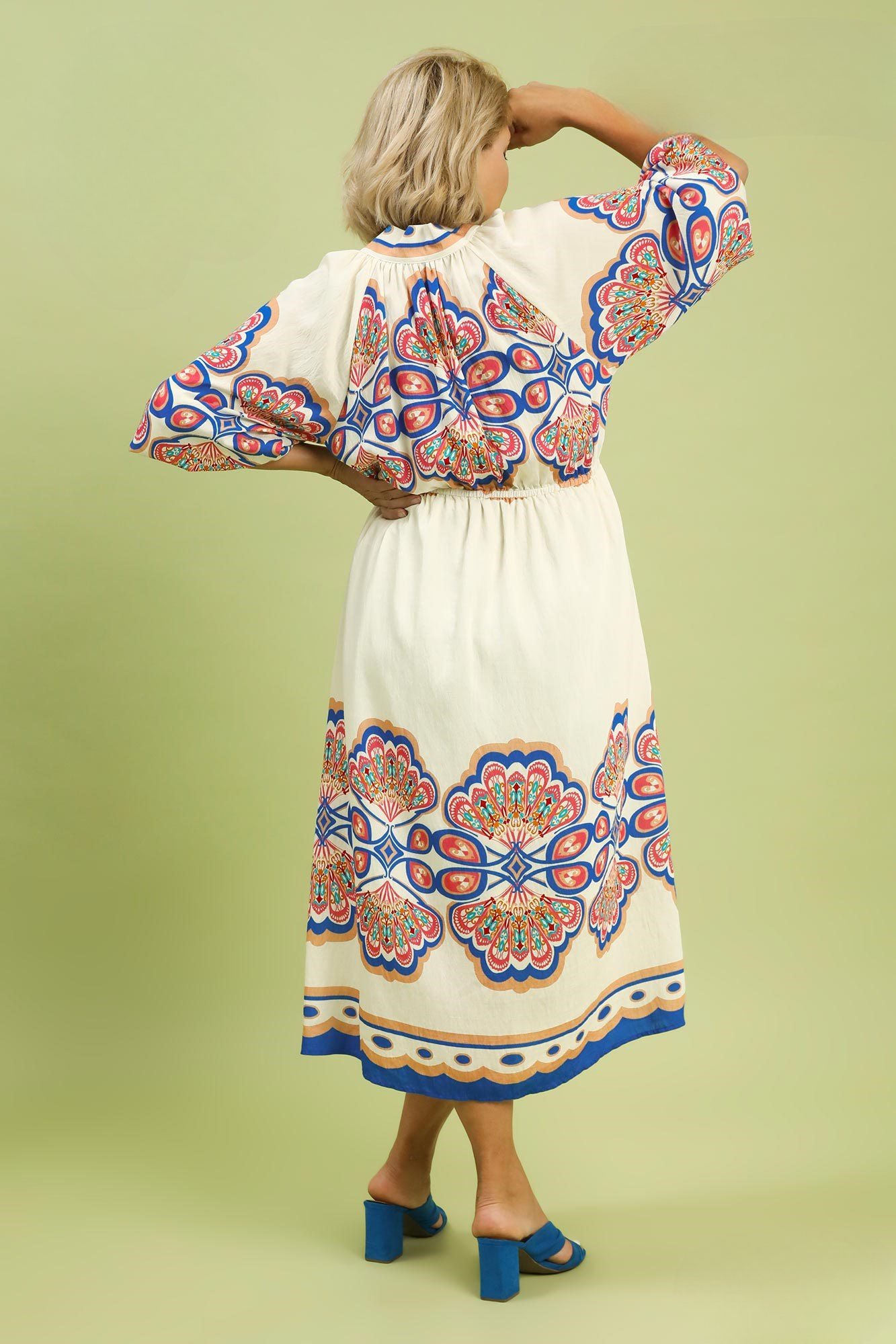 This dress features 3/4 sleeves and a flattering split neckline for a romantic touch. The elastic waist creates a defined silhouette. This lined dress is designed with a plume border print and crafted from a lightweight blend for added comfort. Its midi length makes it versatile for both casual and dressed-up looks. Pair it with your favorite heels or sandals for effortless style! Size down.
