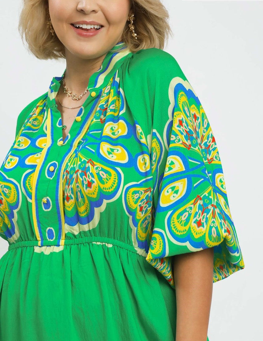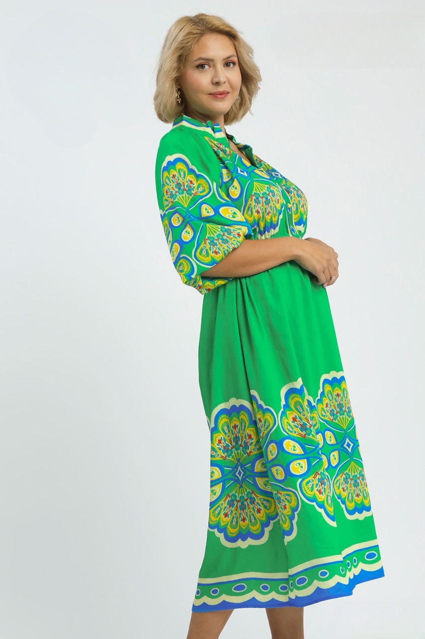 This dress features 3/4 sleeves and a flattering split neckline for a romantic touch. The elastic waist creates a defined silhouette. This lined dress is designed with a plume border print and crafted from a lightweight blend for added comfort. Its midi length makes it versatile for both casual and dressed-up looks. Pair it with your favorite heels or sandals for effortless style! Size down.