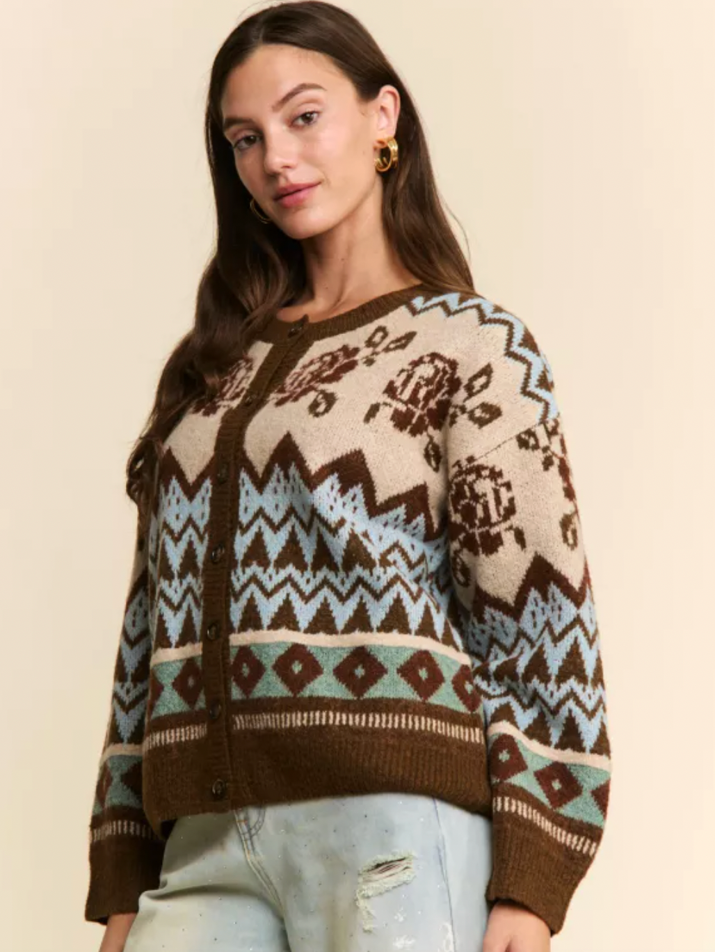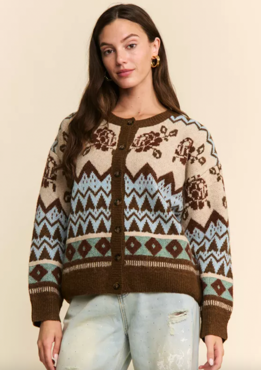 Cozy-meets-cute classic cardigan in a oh so soft, brushed knit featuring a beautiful vintage print. This cardigan is designed with a crew neckline, long sleeves, ribbed trims and buttons down the front for a classic look. Perfect layered & on its own!