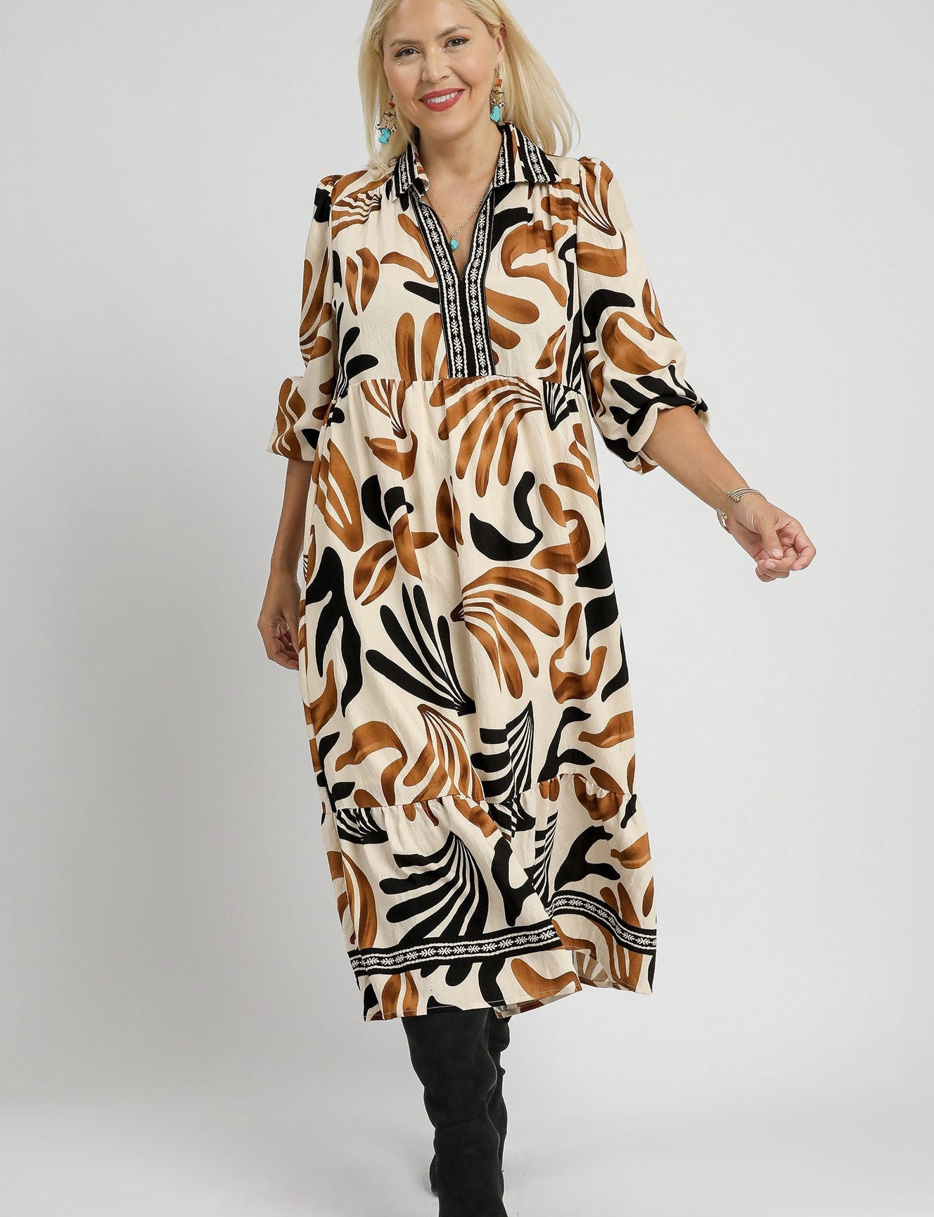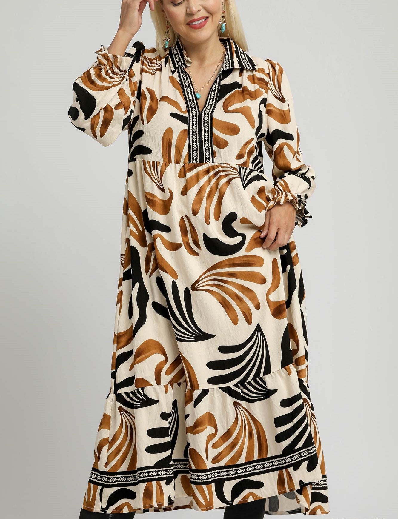 This Midi Dress offers effortless style with its relaxed fit and comfortable design. Featuring a flattering V-neck with a collar, this dress is perfect for layering or wearing on its own. The bubble sleeves add a touch of playfulness, while the lining underneath ensures a smooth and comfortable fit. Ideal for the fall transition, this dress pairs beautifully with booties, sandals, or flats, making it versatile for a range of occasions. Whether you're dressing up for a casual outing or layering with cozy accessories, this boho leafy print midi dress is the perfect addition to your fall wardrobe!